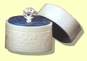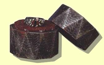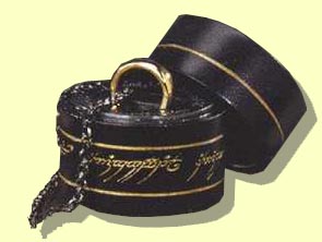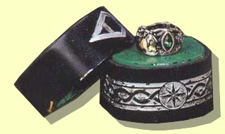 Replicas of various Rings from the Lord of the Rings trilogy, displayed in decorated, and illuminated resin boxes |